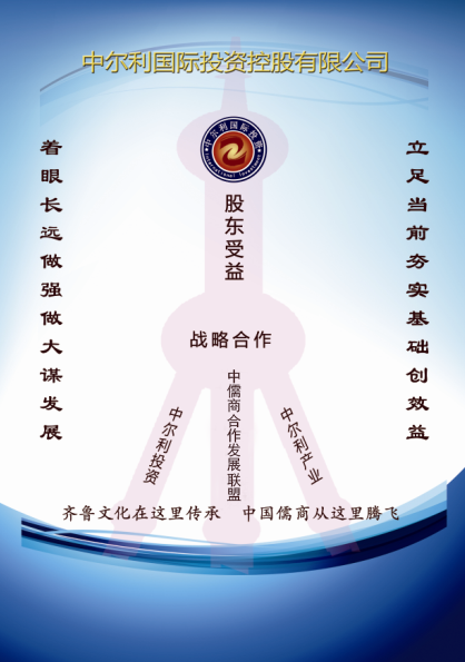 中爾利國(guó)際投資控股有限公司是經(jīng)國(guó)家有關(guān)部門批準(zhǔn),2003年4月北京市工商局登記注冊(cè)的綜合性企業(yè)。公司的經(jīng)營(yíng)戰(zhàn)略是以國(guó)家產(chǎn)業(yè)轉(zhuǎn)移與提升為指導(dǎo),“京津冀一體化”、“一帶一路”為框架,城鎮(zhèn)建設(shè)為方向,形成金融公共資產(chǎn)證券化(REITs)、能源和新材料、文化、鄉(xiāng)村振興四大業(yè)務(wù)板塊,重點(diǎn)投資中西部金融、交通、新能源、房地產(chǎn)、礦業(yè)、文化、教育、城建、國(guó)際貿(mào)易等項(xiàng)目。目前我公司發(fā)起成立的“中儒商合作發(fā)展聯(lián)盟”為聯(lián)盟企業(yè)發(fā)展提供更好的服務(wù)。公司人脈資源豐富,資本實(shí)力雄厚,擁有各行業(yè)項(xiàng)目?jī)?chǔ)備;長(zhǎng)期與中科院、北京大學(xué)、清華大學(xué)、北京化工大學(xué)等重點(diǎn)科研院校保持著密切的技術(shù)合作;與重點(diǎn)金融機(jī)構(gòu)有授信和戰(zhàn)略合作。公司始終奉行“立足當(dāng)前夯實(shí)基礎(chǔ)創(chuàng)效益、著眼長(zhǎng)遠(yuǎn)做強(qiáng)做大謀發(fā)展”的理念,堅(jiān)持“科學(xué)發(fā)展、規(guī)范管理、合作共贏”的投資方針,真誠(chéng)同國(guó)內(nèi)外企業(yè)及同仁進(jìn)行廣泛交流與戰(zhàn)略合作。